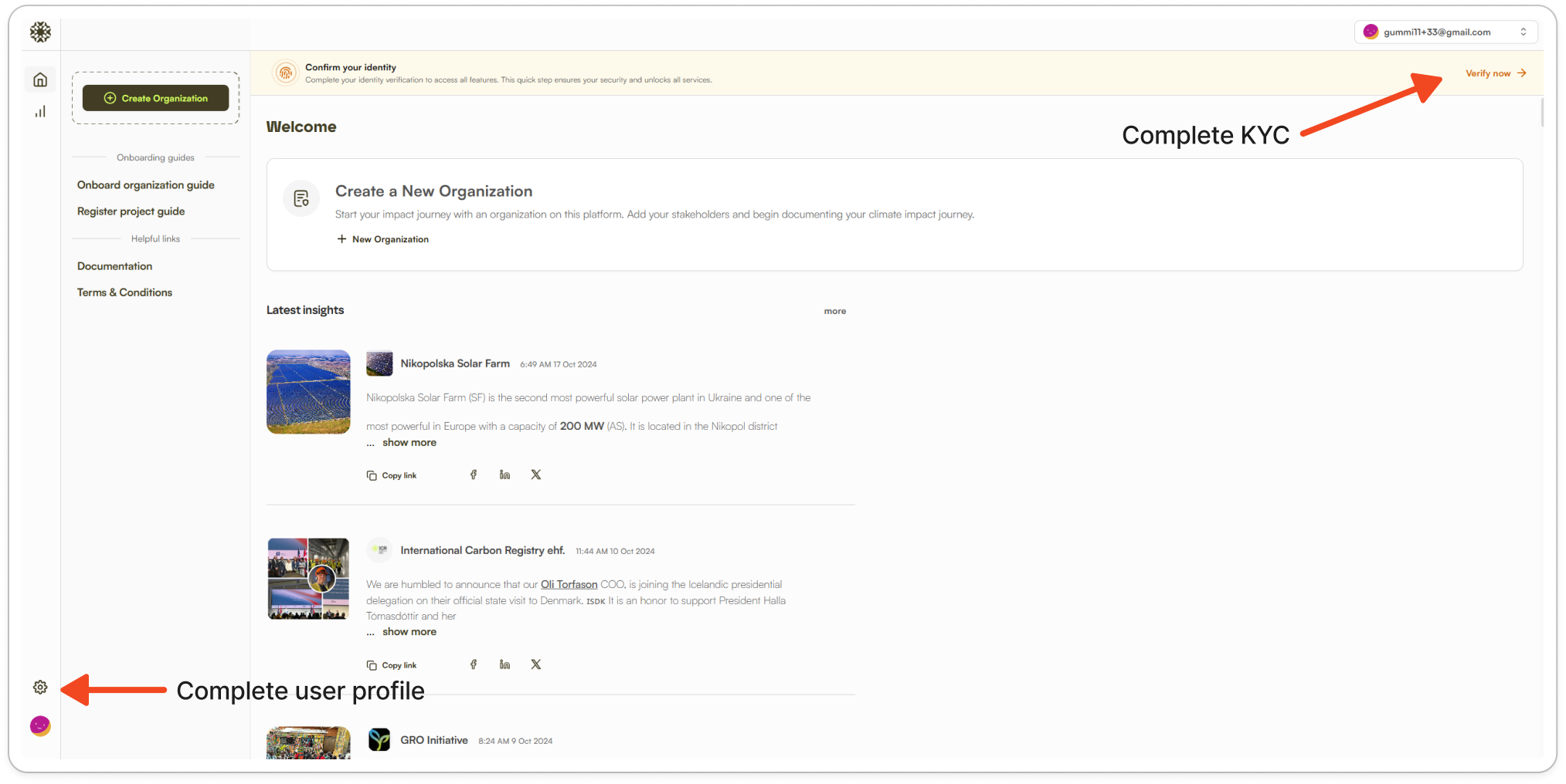 From your welcome screen you can complete your user profile and verify your identity with our KYC process.&#x20;