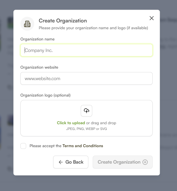 You are prompted to provide the name of the organization, website, logo and agree to terms and conditions applicable for organizational accounts.
