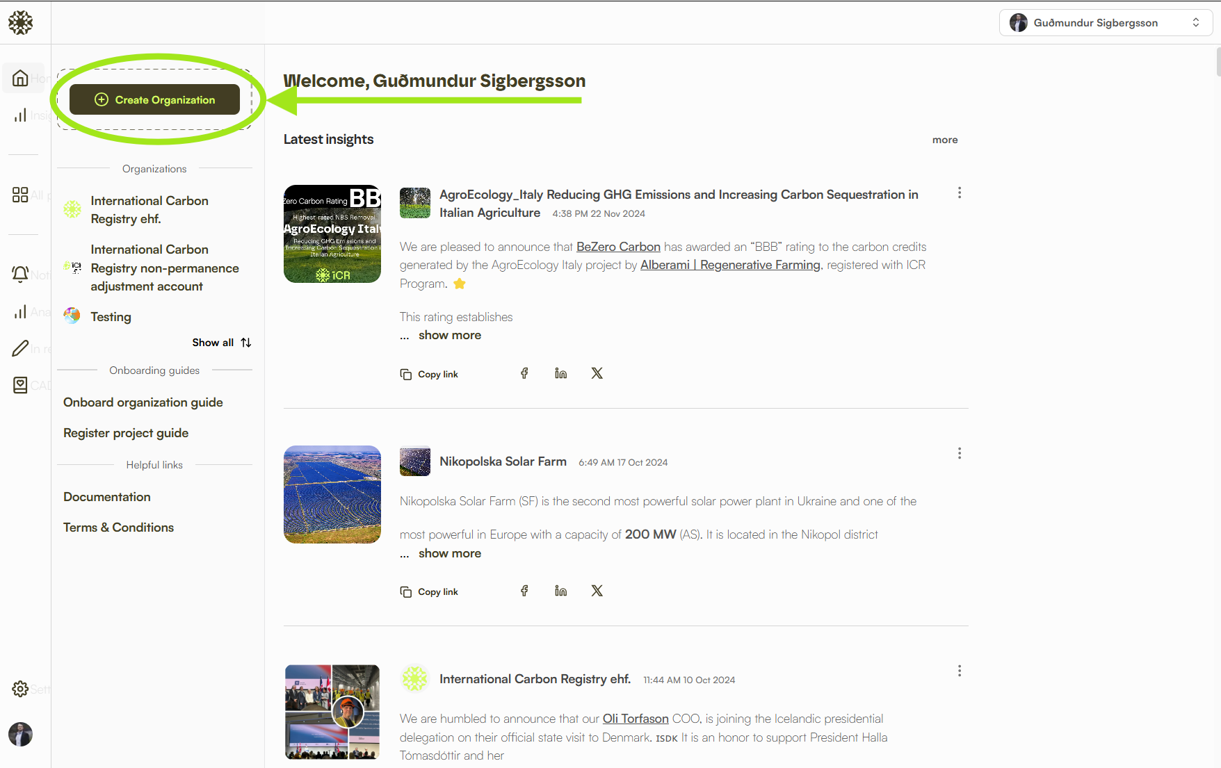 Organizations that intend to register projects and issue credits must complete a KYB, and the user creating the organizational account must be authorized to do so.