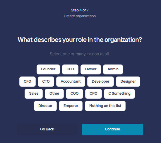 Here, you provide details about the type of account you are creating. Please see the definitions of different roles in the registry.