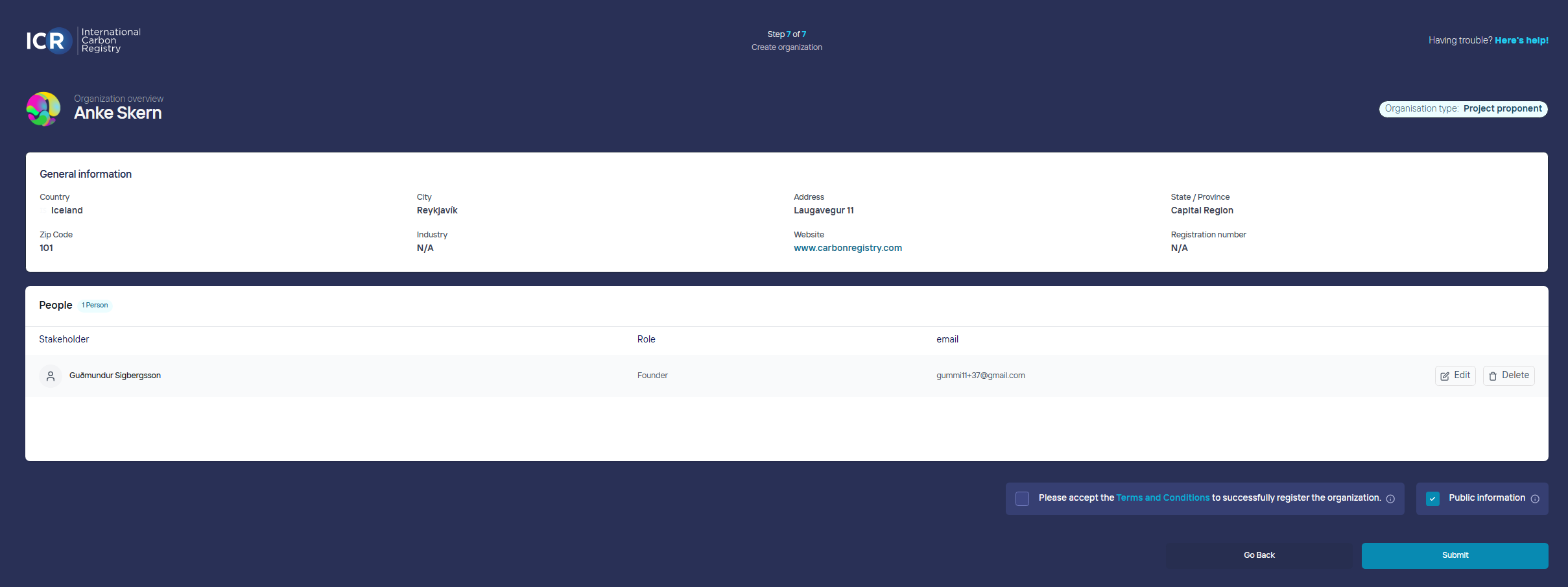 If you are a Project proponent, project developer, market participant, or a VVB, you must have a public profile. For other organizational types, you may choose to have a private account where your information is not publicly available. When you click submit you have created your organizational account.