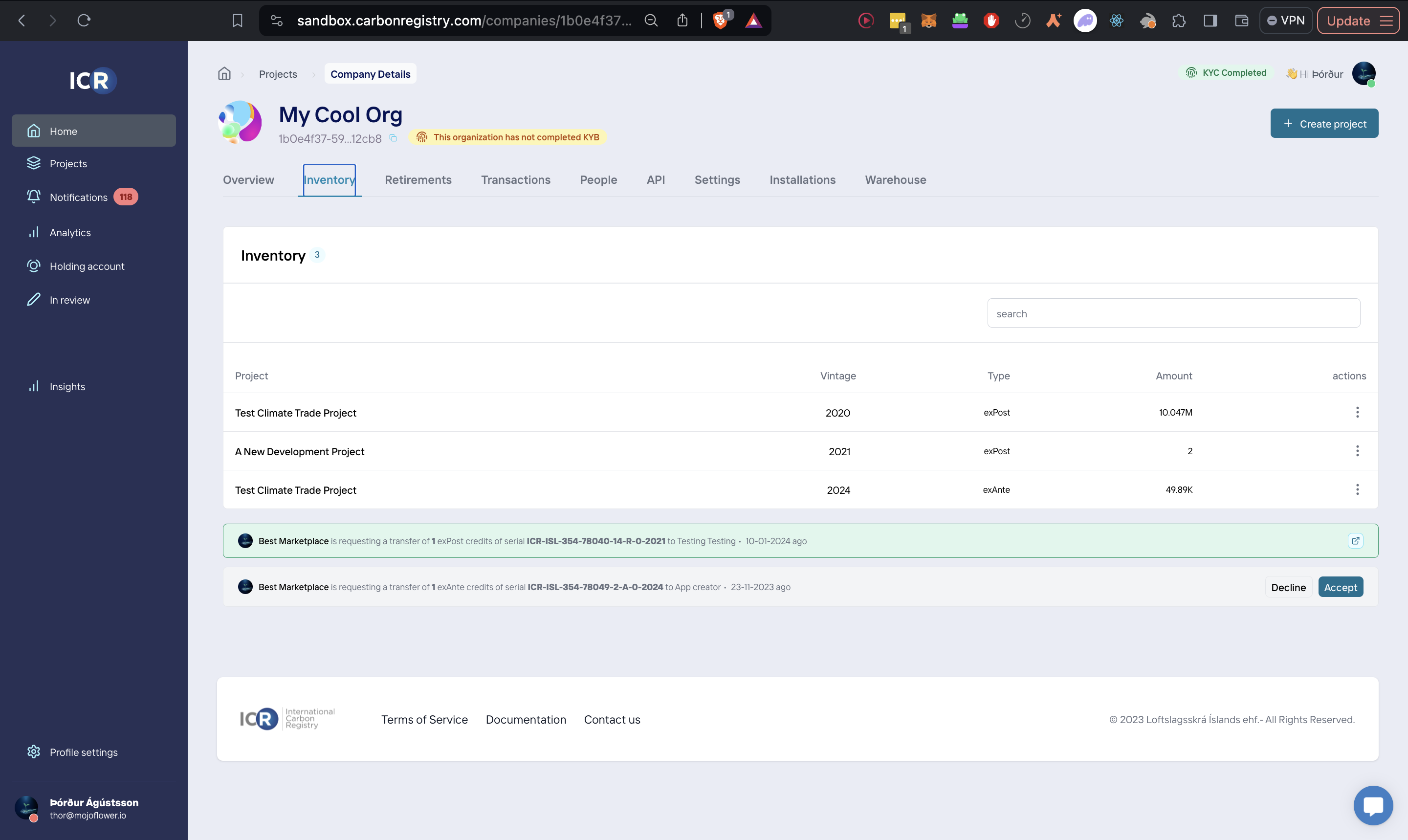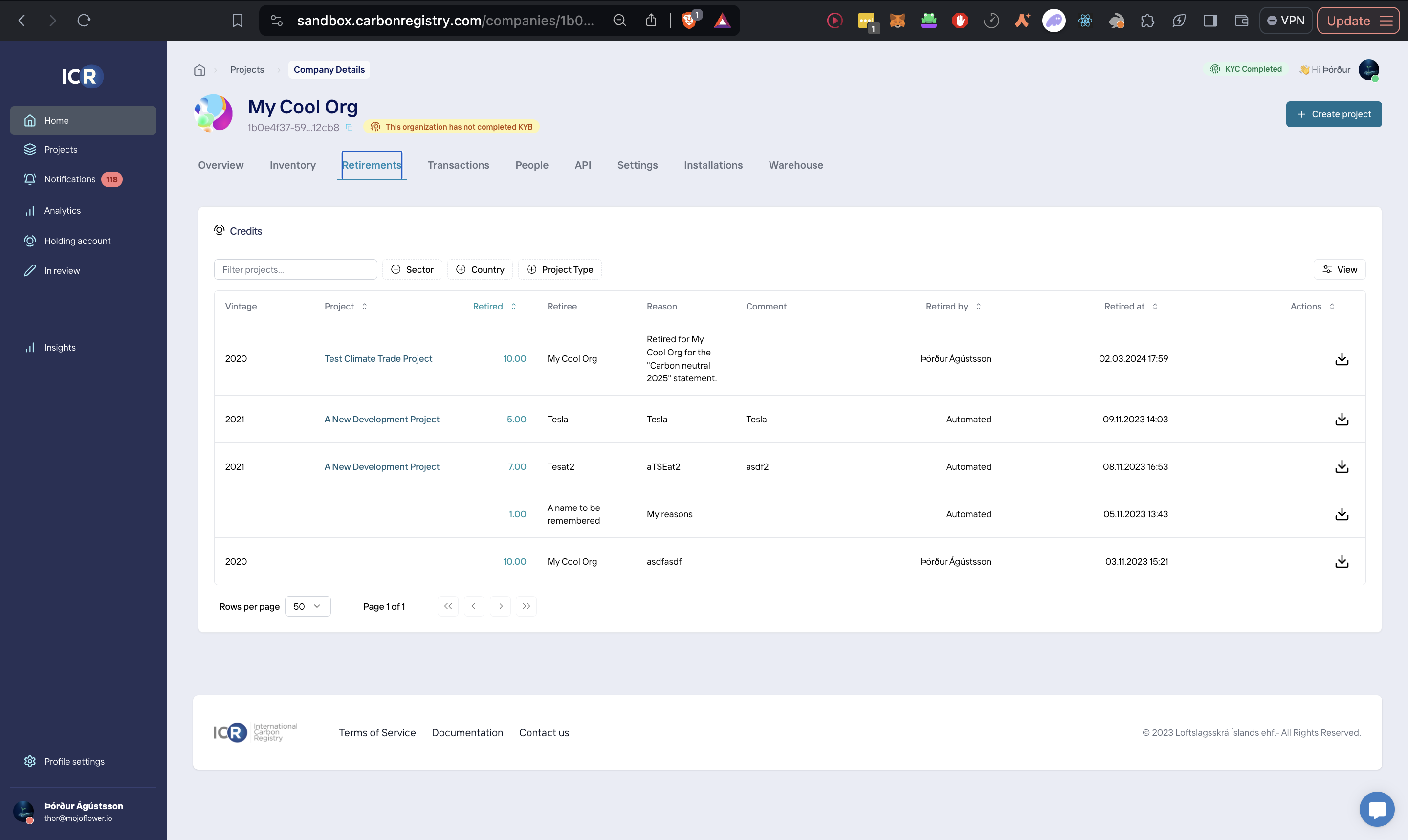 The retirements tab is where all your organization's retirements are. You can download a retirement certificate for each retirement via the actions download button.