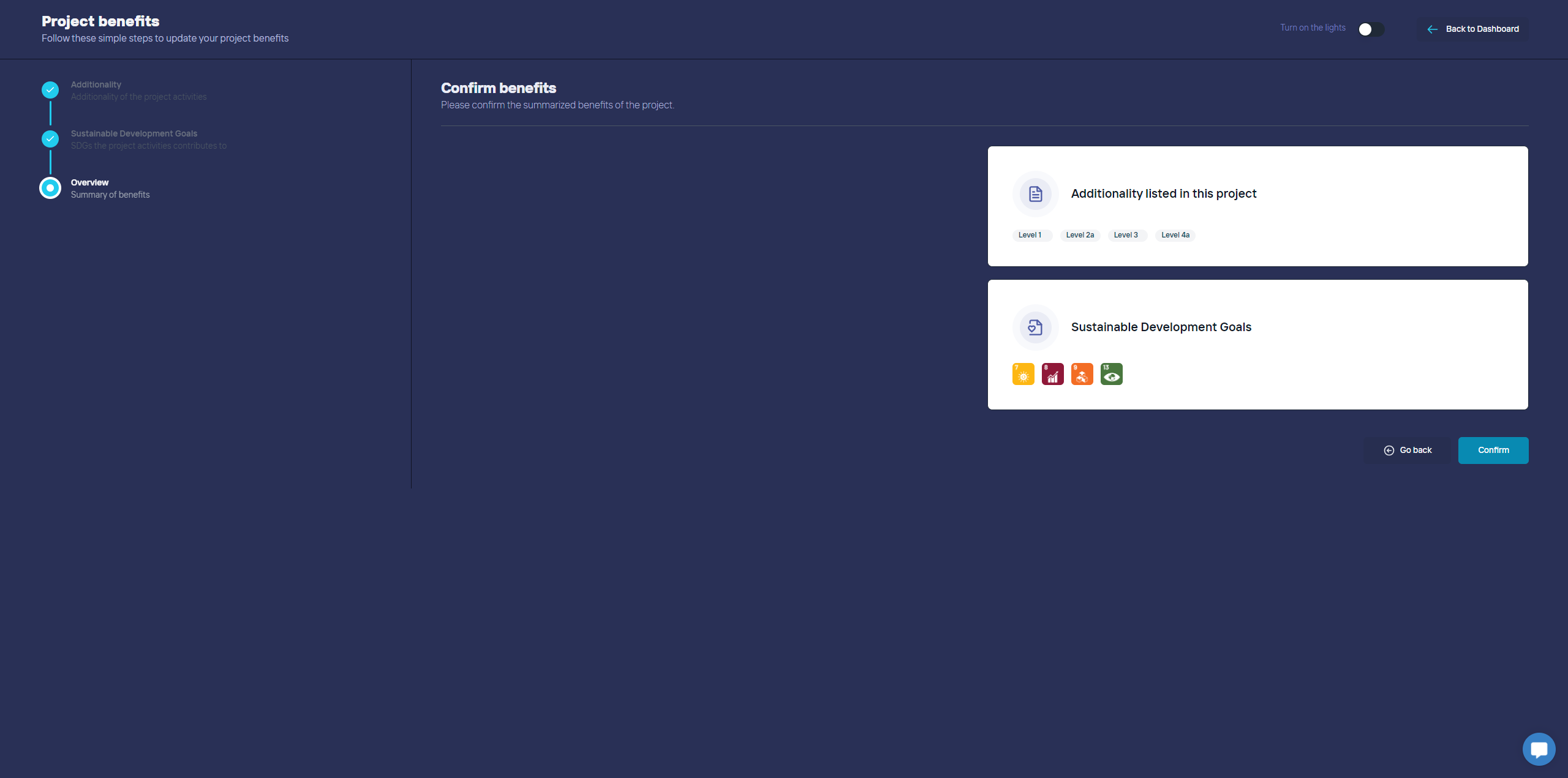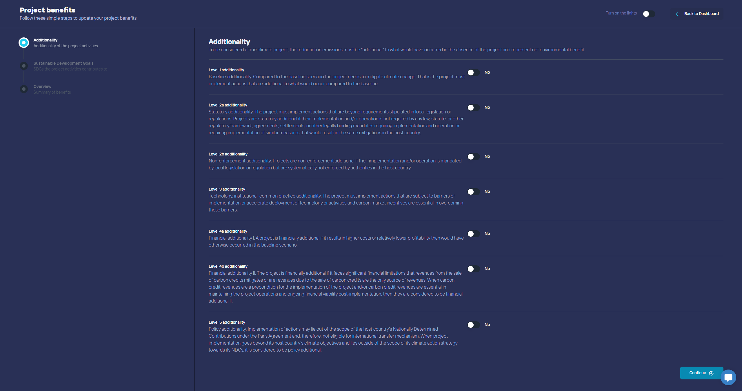 Finally you need to confirm additionality levels and SDG´s.&#x20;