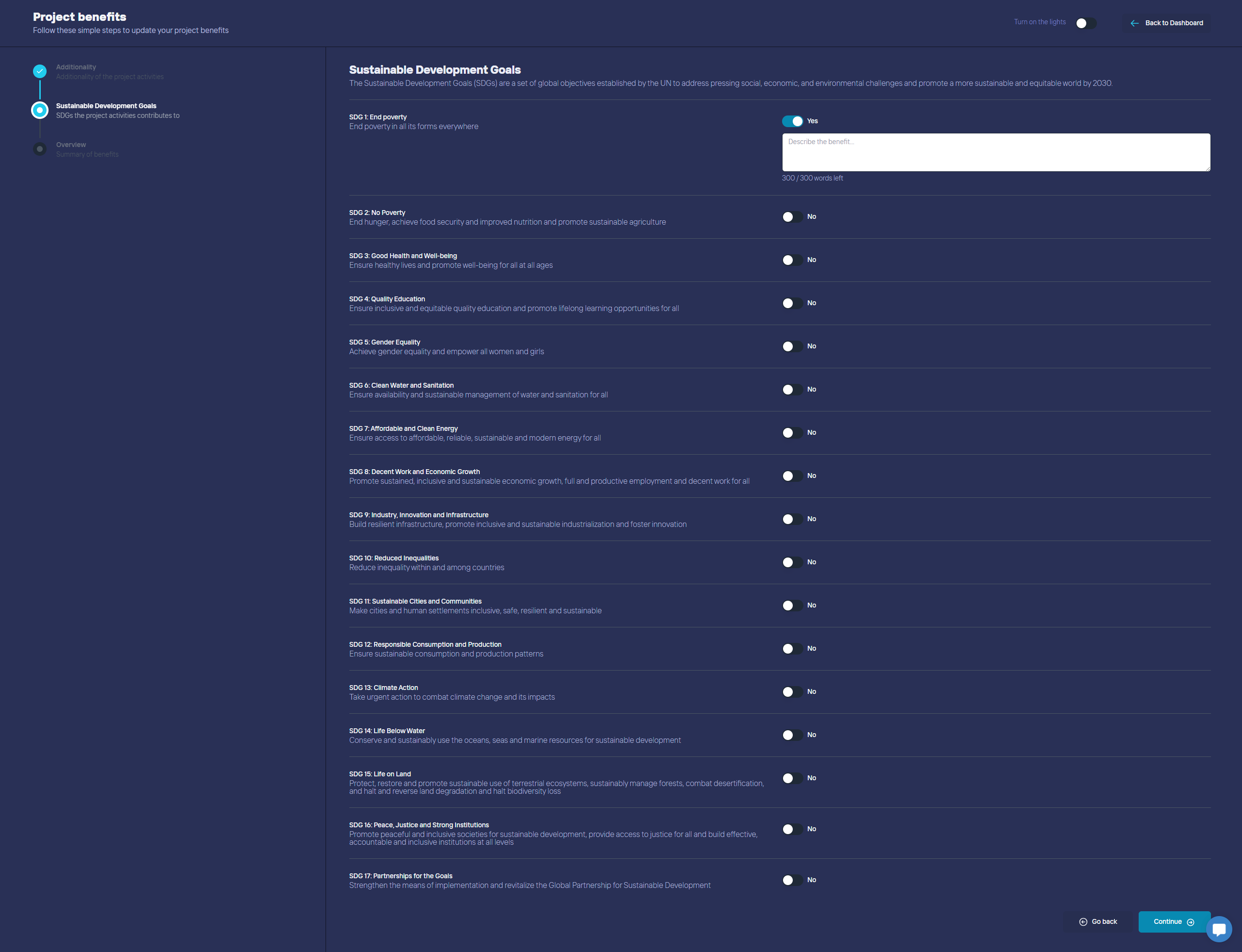 Next you can provide information about any other SDGs the project supports. You need to provide information about how the project supports each selected SDG.&#x20;