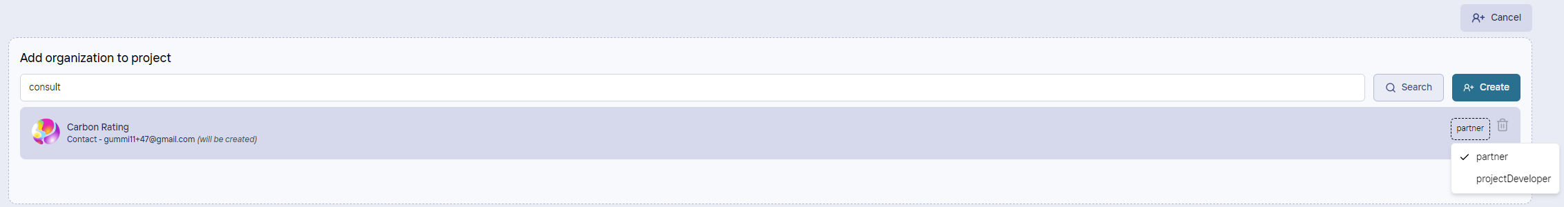 If you find a current organization by searching for a name or an account ID, you can add the organization as a Partner to the project by hovering over the user and clicking "Add partner".&#x20;