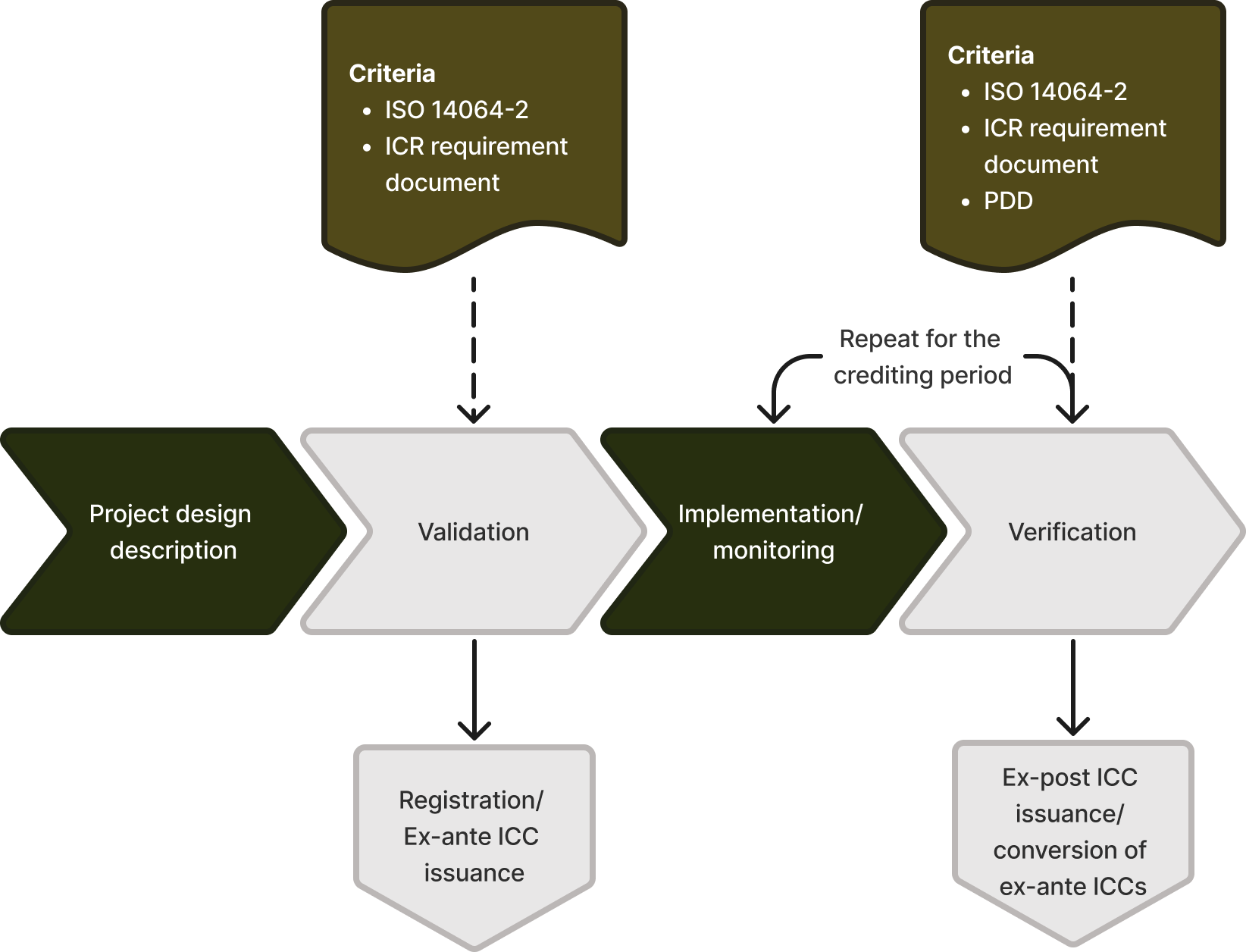All projects are subject to validation of projects and mitigations subject to verification. Validation/verification bodies (VVBs) assess projects for conformity to ICRs Requirements, ISO 14064-2. VVBs are qualified, independent third parties which ICR approves to conduct validation and verification based on their accreditation.